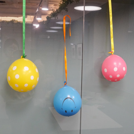 1. 매달린 풍선을 응원 막대로 맞추며 집중력을 높여요.