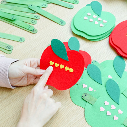 숫자 애벌레 놀이는 같은 개수의 하트가 있는 사과를 찾아 숫자 애벌레를 끼우며 수와 양의 대응을 경험하고, 소근육 발달을 촉진하는 놀이랍니다.
