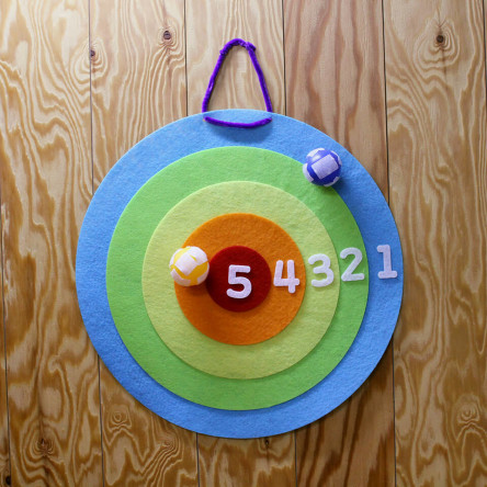 과녁판을 향해 공을 던지며 대근육과 신체조절력을 기를 수 있고, 과녁판 숫자를 확인하며 1-5까지 수 개념을 형성하는 데에 도움이 됩니다.