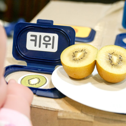 겉과 속이 서로 다른 모습을 하고 있는 과일의 특징은 아이의 인지 발달을 도울 수 있는 흥미로운 소재가 됩니다. 버리기 아까운 튼튼한 물티슈 캡에 '물티슈 과일 까꿍 스티커'를 붙여주기만 하면 이 특징을 제대로 활용한 두뇌자극 장난감이 뚝딱 탄생하지요.