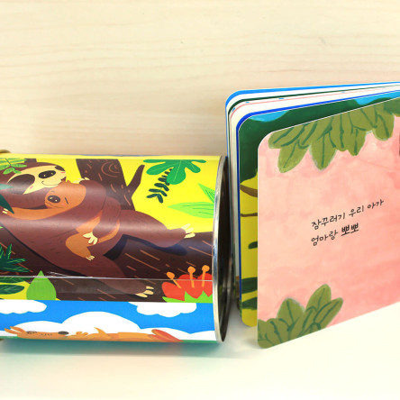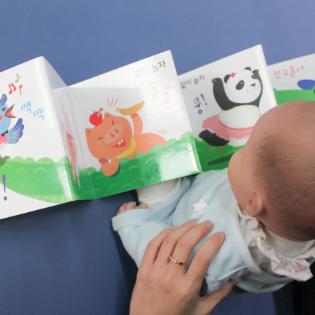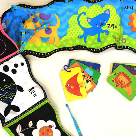 한 면에는 <흑백 초점 그림책>을 담아냈으며, 한 면에는 <알록달록 동물 그림책>을 담아냈습니다. 유아에게 친근한 사물과 동물이 그려져 있습니다.