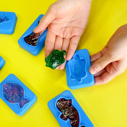 '바다동물 젤리 만들기'는 젤라틴 가루에 물, 색소 등을 혼합하고 틀에 굳혀 직접 모양 젤리를 만들어 볼 수 있는 재미있는 놀이 키트입니다. 18개월 이상 아이와 함께 놀이하실 수 있어요!