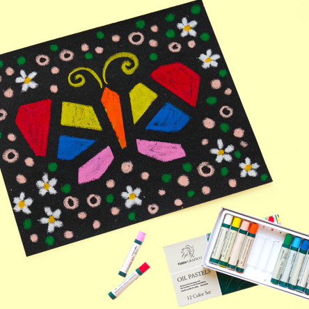 -오일 파스텔 12색 1세트, 종이 사포지 3장, 검정 도화지 8절 5장, 마스킹 테이프 1개