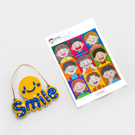 ♡ 옵션 1 (Smile - 1인용) : 우드 레터링 'Smile' 1개, 칼라폼 (파랑 / 10g) 1봉지, 꼬마 바다 비즈 (2g) 1봉지, 색 자갈 (하늘 / 2g) 1봉지, 마사 (4합~6합 / 40cm) 1줄, '모두 웃어요' 색칠 활동지 (A4) 1장