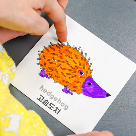 퍼즐 뒷 면에는 동물과 곤충의 이름, 사랑스러운 문장이 한글과 영어로 써 있고, 놀이가 끝나면 박스에 담아 깔끔하게 정리할 수 있어요.