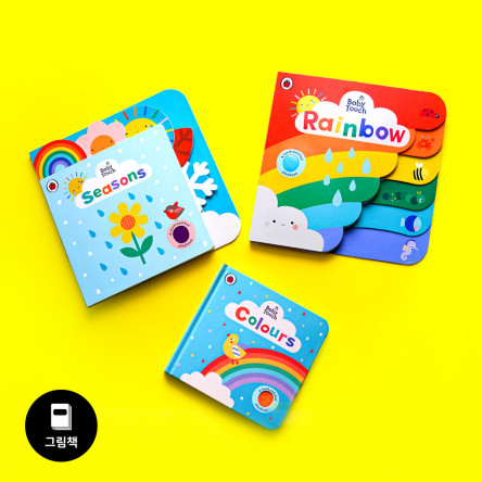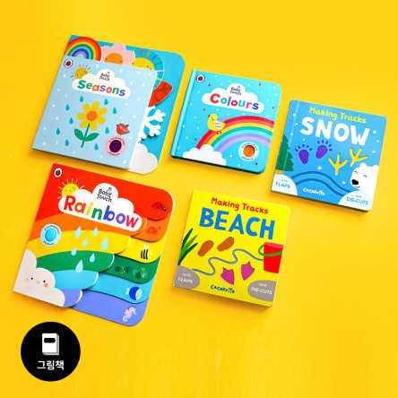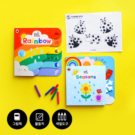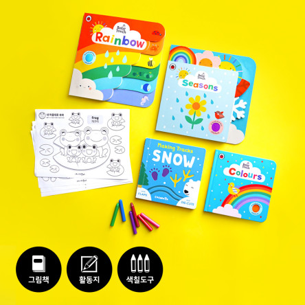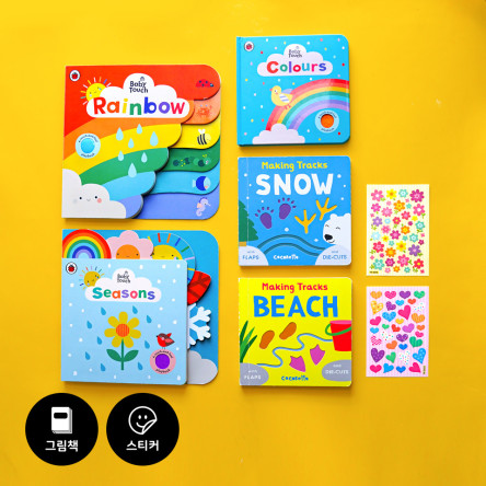 👶 세트 구성품: 옵션 1~옵션 5 각 1권씩 Baby Touch 촉감북(3권/ 빅북 Rainbow , Seasons 2권 + 스몰북 Colours 1권) + Child's Play 플랩북 (SNOW , BEACH 2권) + 독후 놀이 활동지 파일(11장: 다운로드 파일 제공) + [사은품] 쁘띠 스티커(2종)
