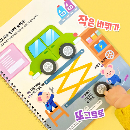 🐶 구성품: 워크북 '부릉부릉 색깔 자동차' 1권 + 지우개 달린 보드 마커 1개 + 벨크로 원형 스티커 (까슬이+보슬이) 7쌍 + 자동차 바퀴 4개 + 자동차 바퀴 쇠막대 2개 + 칼라 끈 1줄