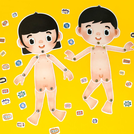 ** 몸 (얼굴, 몸통, 손, 발, 팔, 다리) 총 10개의 부분과 신체 명칭 카드(머리, 가슴, 목, 다리, 어깨, 유두, 팔, 무릎, 손, 배꼽, 배, 음경-남자 또는 음순-여자, 발꿈치, 발) 총 14개로 구성되어 있습니다.