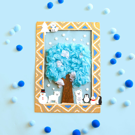 골지 나무 꾸미기 판 1개 + 습자지 5장(하늘 4장, 하양 1장)+ 시트지 1장 + 북극 동물 꾸미기 스티커 1장