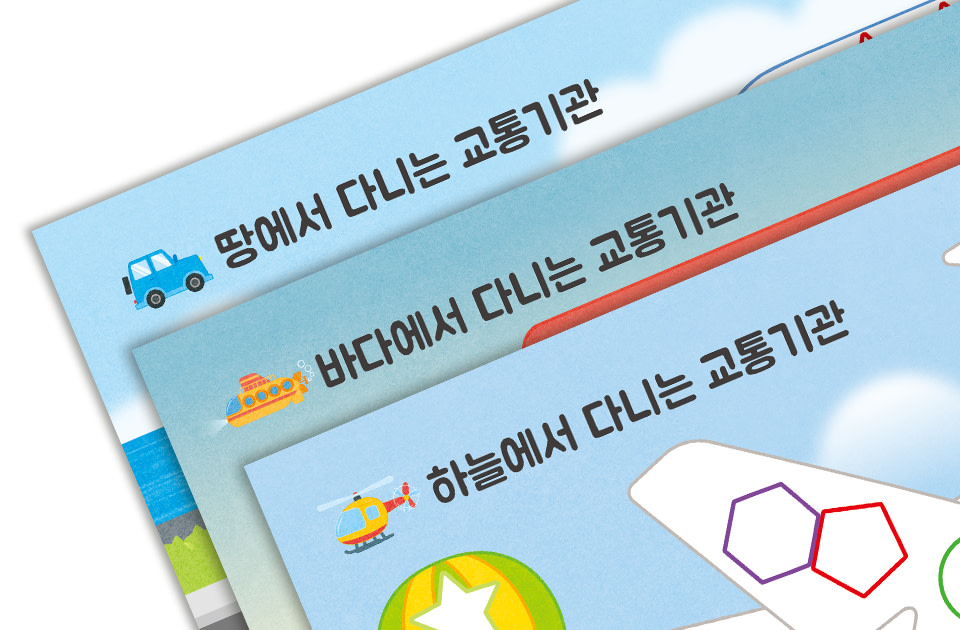 💛 활동지는 '땅에서 다니는 교통기관', '하늘에서 다니는 교통기관', '바다에서 다니는 교통기관' 총 3가지 테마로 구성되어 있습니다.