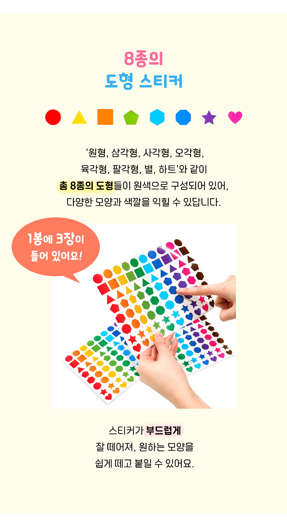 💛 도형 스티커 ①은 '원형, 삼각형, 사각형, 오각형, 육각형, 팔각형, 별, 하트'와 같이 총 8종의 도형으로 총 80개의 스티커로 구성되어 있습니다.