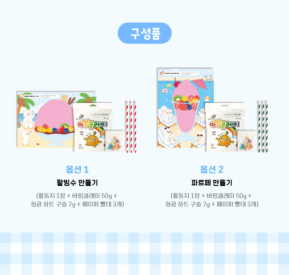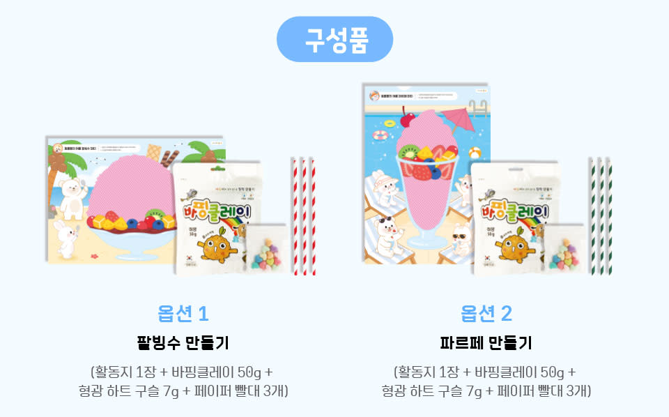 | 구성품 | [옵션 1] 팥빙수 팥빙수 만들기 활동지 1장 - 210 × 297mm(A4 사이즈), 컬러, 종이 / 바핑 클레이 1봉, 중량 50g, 하양, 클레이 / 형광 하트 구슬 12~13알 (색상 혼합), 지름 1.5cm, 중량 총 7g (1알 0.6g), 플라스틱 외 / 페이퍼 빨대 3개, 지름 약 0.5cm, 길이 19.5cm, 중량 1.1g (1개 기준), 무늬, 색상 랜덤, 종이 |