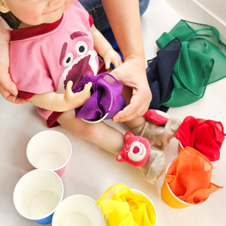 [차이의 무지개 스카프 놀이]는 오감 놀이가 중요한 우리 아기의 시각 발달을 고려한 색상 선택과 안전한 재료로 구성했답니다.