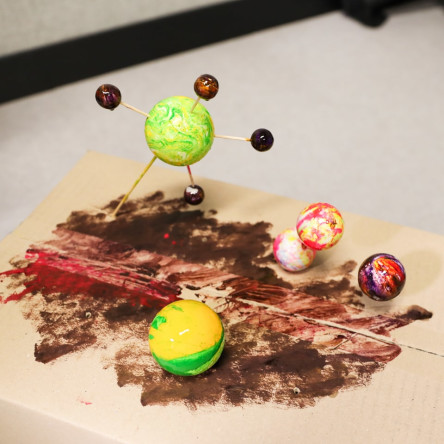 물감이나 색깔 매직과 같은 색채 도구로 스티로폼 공 위에 색칠을 해보세요. 아이가 좋아하는 색깔의 작품을 완성할 수 있습니다.