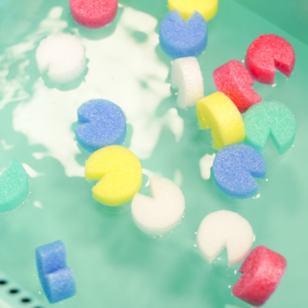 백업을 조각으로 자르고 쥐고 뿌리며 오감 놀이를 해보세요. 색깔과 촉감에 즐거운 자극을 전달할 수 있습니다.
