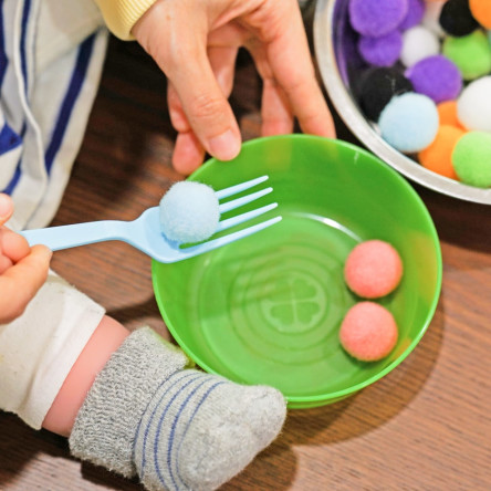 숟가락과 포크로 같은 색깔의 폼폼이를 담아 옮겨보세요.