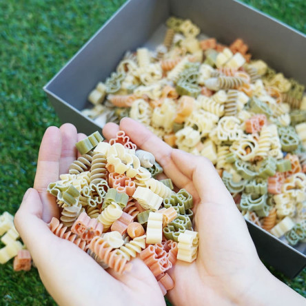 삼색 동물원 파스타는 품질 좋은 듀럼 세몰리나 밀과 천연색소(토마토, 시금치로)로 색을 낸 건강한 모양 파스타로,