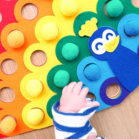 * 아이는 공작의 날개와 같은 폼폼이를 찾아 구멍에 올려놓으며 색 인지 능력이 발달하고, 눈과 손의 협응력과 소근육 조절 능력이 길러집니다.