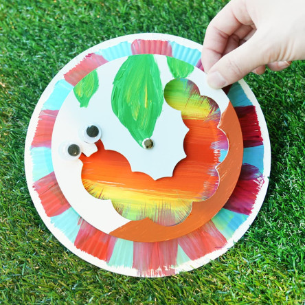 4. 종이 접시 가운데에 송곳으로 구멍을 뚫고 애벌레 그림판을 올려 쇠 단추로 연결합니다.