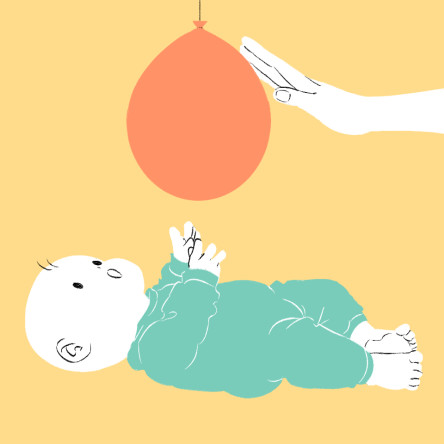 - 아기가 떨어진 재료를 놀이 천 위로 던집니다.