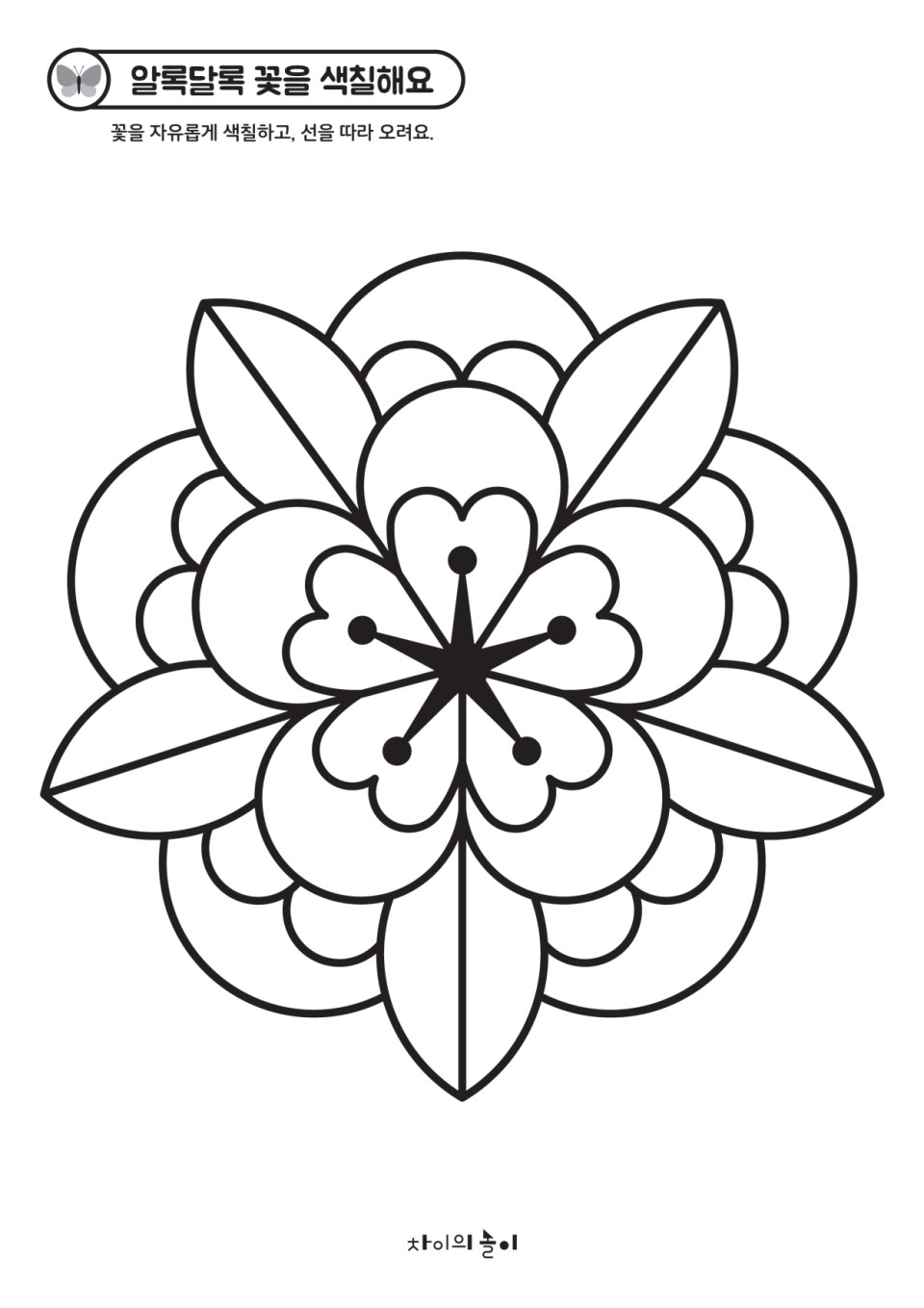 - 꽃 도안을 자유롭게 색칠하고, 오립니다.활동지는 첨부된 PDF파일을 차이의 놀이 회원 로그인 후 다운로드해서 활용하실 수 있어요. (25년 4월 14일부터 첨부 pdf파일로 제공) 연출된 사진 속에는 파스넷을 사용했어요.색칠 도구에 따라 다양한 느낌의 꾸미기가 가능합니다.