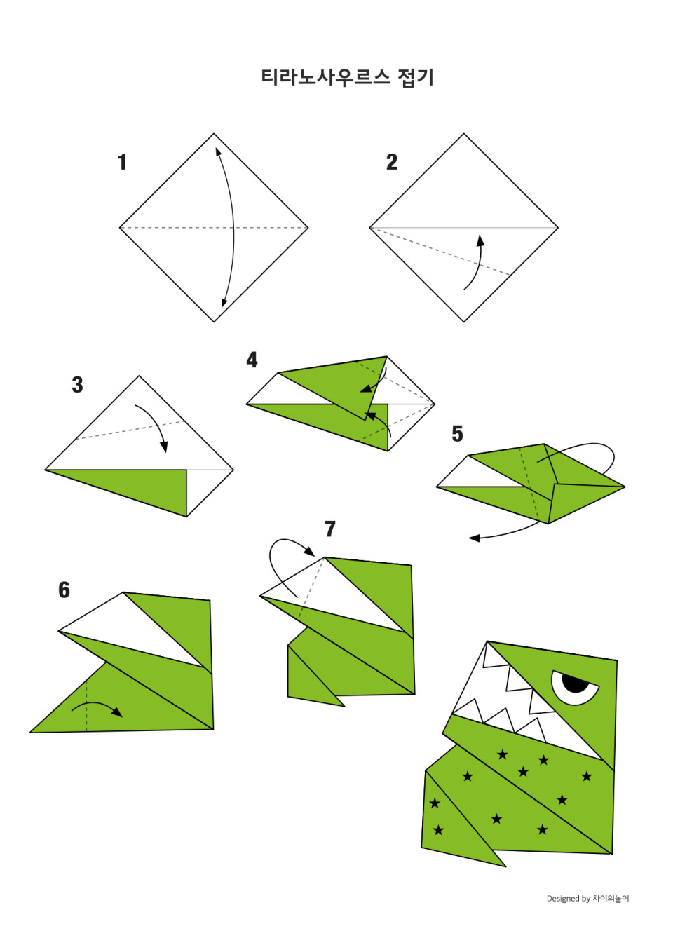 공룡을 접어 역할놀이를 해 봅시다. 엄마와 아이가 공룡을 하나씩 맡아 서로 공룡처럼 이야기를 나누고, 상황극을 하며 상상력이 발휘되는 동시에 다양한 표현을 배울 수 있습니다.