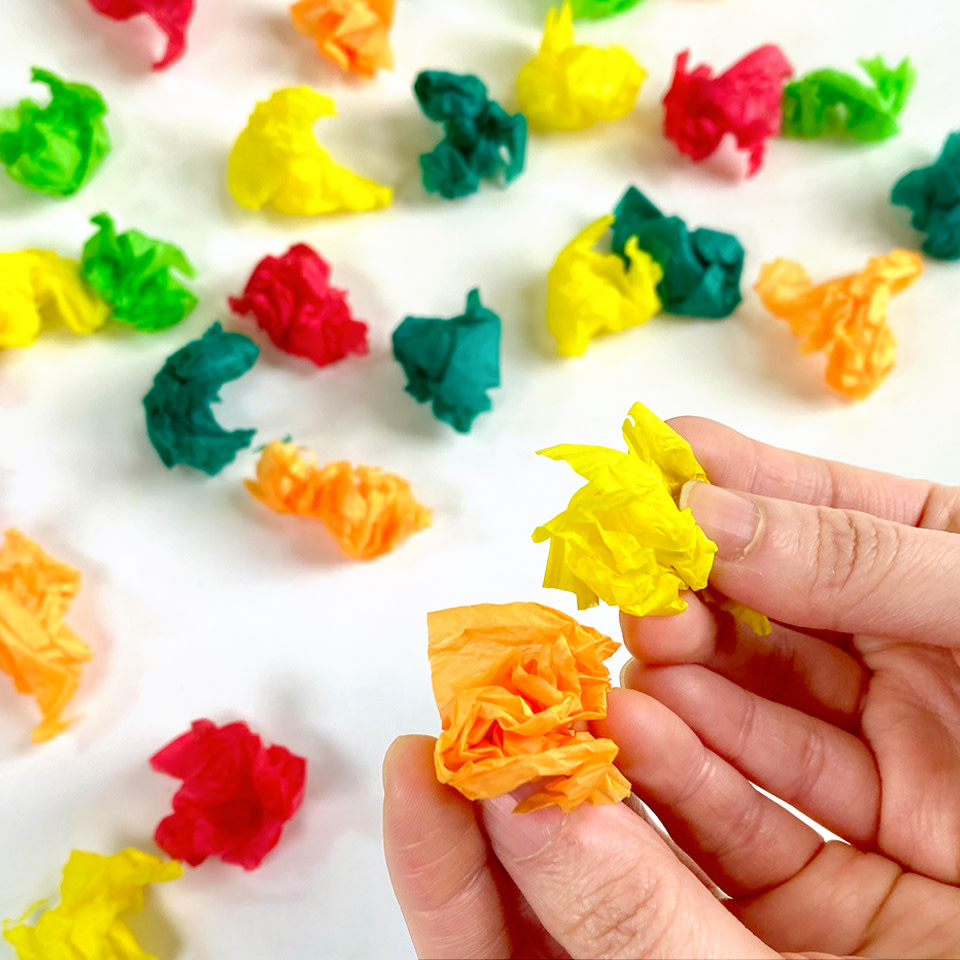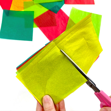 - 색깔 습자지를 조각으로 자릅니다.조각의 크기를 8~9cm 크기로 잘라 주세요. 가위 대신 손으로 찢어도 좋습니다.