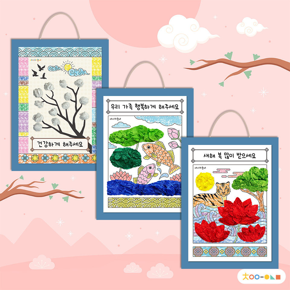 전통 민화 도안 1장, 도안 대지 색상지 1장, 습자지, 금사 또는 은사 이 패키지만 있으면 놀이 준비 끝!