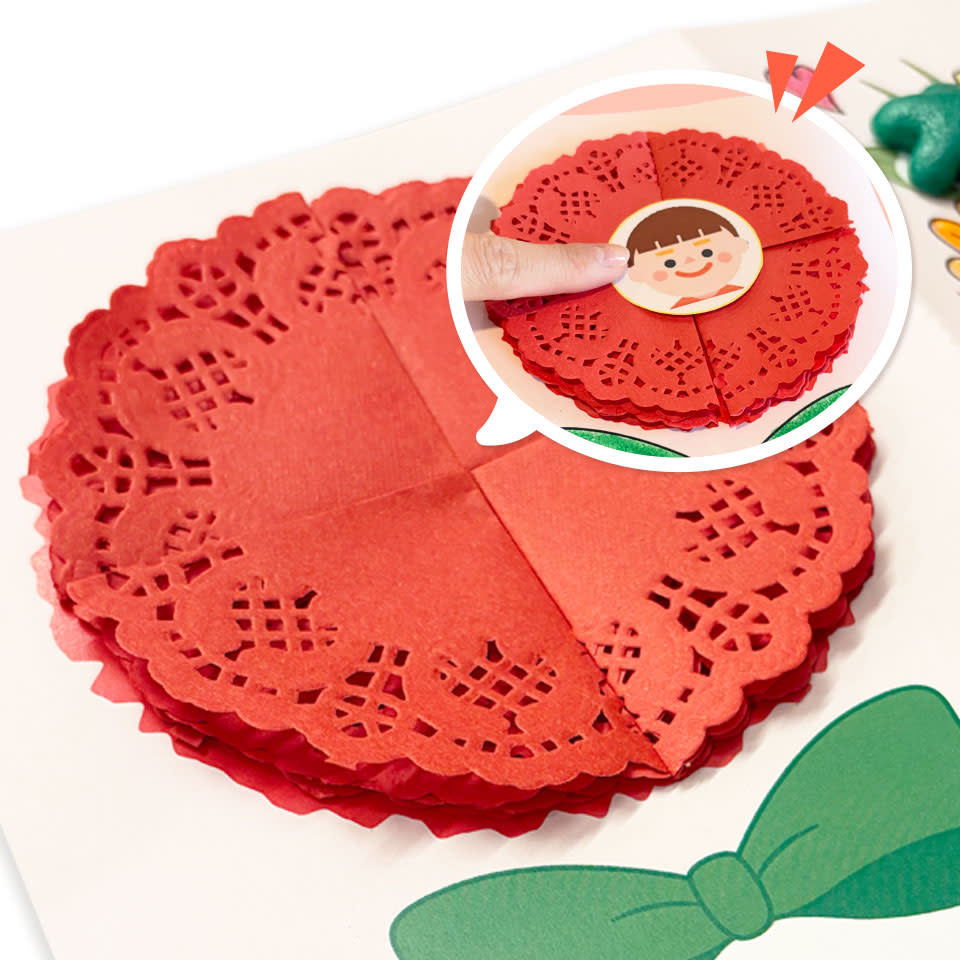 - 빨간색 카네이션 배경에 4개의 부채꼴 모양 종이를 동그랗게 붙여요.가운데 부분에 아이들 사진을 붙여줘도 좋아요.