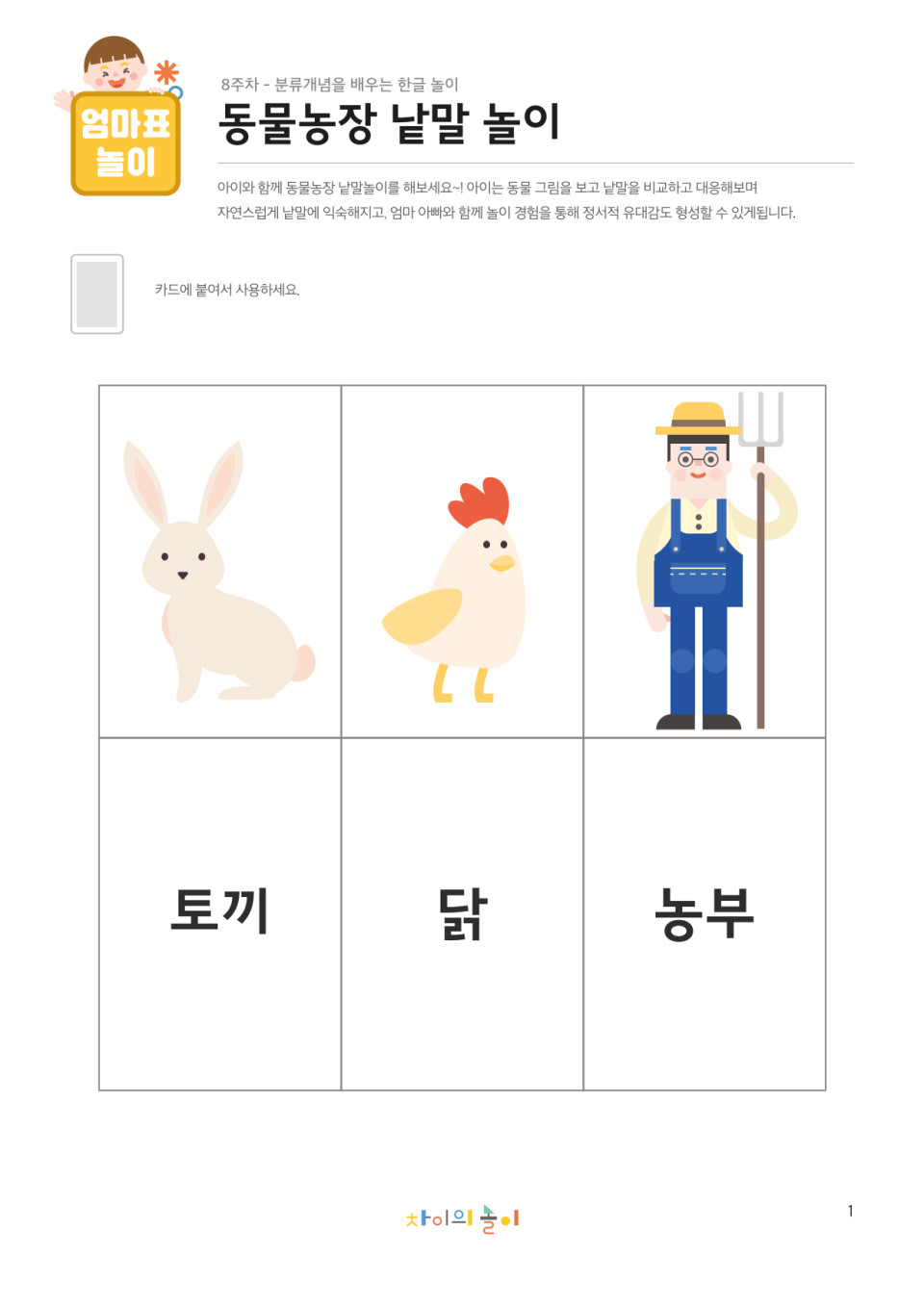 아이와 함께 동물농장 낱말놀이를 해보세요~! 아이는 동물 그림을 보고 낱말을 비교하고 대응해보며 자연스럽게 낱말에 익숙해지고, 엄마 아빠와 함께 놀이 경험을 통해 정서적 유대감도 형성할 수 있게됩니다.