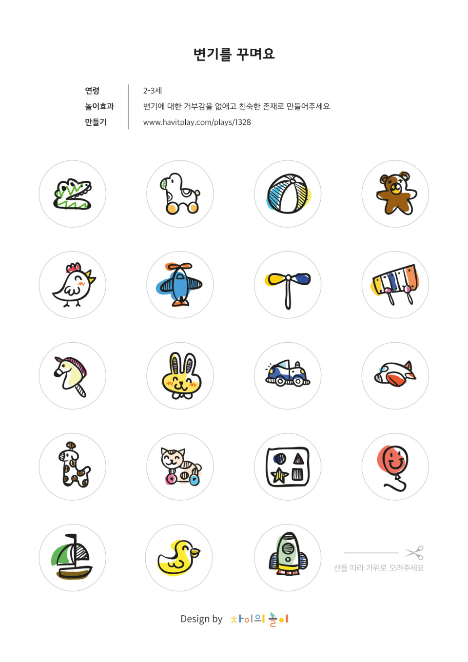 변기를 꾸미는 놀이를 통해 변기에 대한 거부감을 없애고, 친숙한 존재로 생각하여 변기에 배변하는 습관을 형성할 수 있습니다.