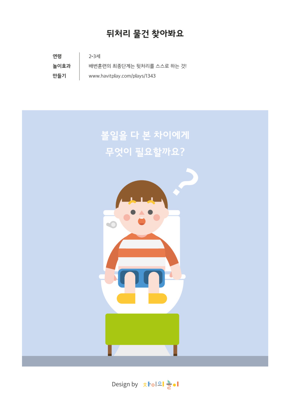 ![]() | (배변 후 사용할 물건들을 아이 앞에 보여주며)어떤 물건이 있는지 우리 차이가 살펴볼래? |