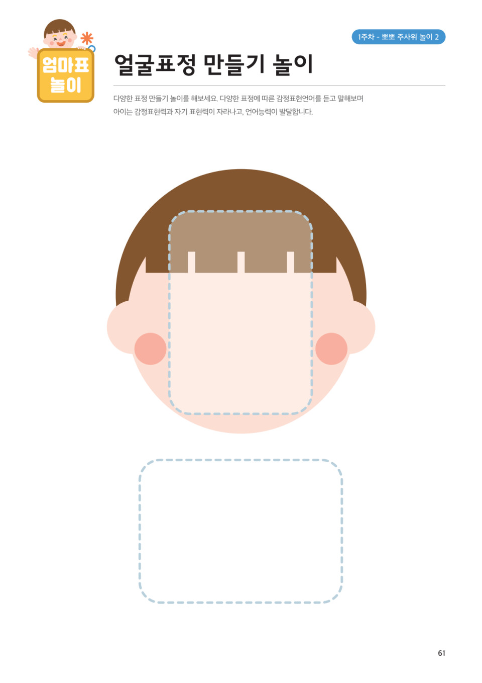 다양한 얼굴 표정을 만들기 놀이를 해보세요. 다양한 표정에 따른 감정 표현 언어를 듣고 말해보며 아이는 감정표현력과 자기표현력을 증진시키고, 언어능력을 발달시킬 수 있습니다.