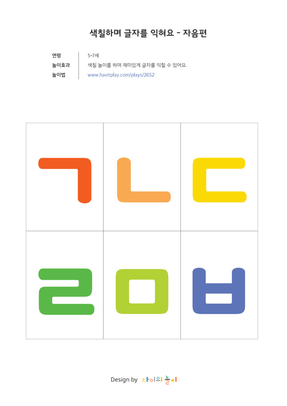 자음 색깔 카드를 뽑아 같은 색깔로 색칠하는 놀이를 해보세요. 한글을 익히는 아이가 놀이를 통해 자연스럽게 자음에 대해 익숙해지고 같은 색깔을 변별해내는 과정에서 관찰력을 기를 수 있습니다.