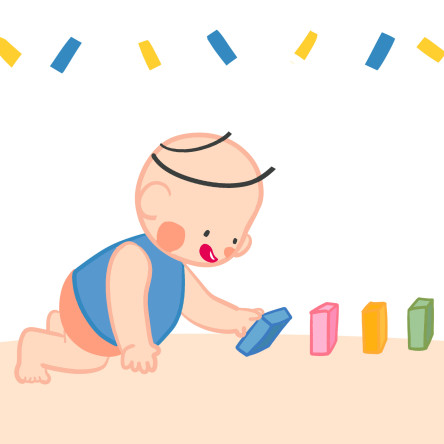 아기가 순서대로 블록을 이어 붙이지 않아도 괜찮아요! 아기가 블록을 쥐고 스스로 놀이할 수 있도록 격려해주세요.