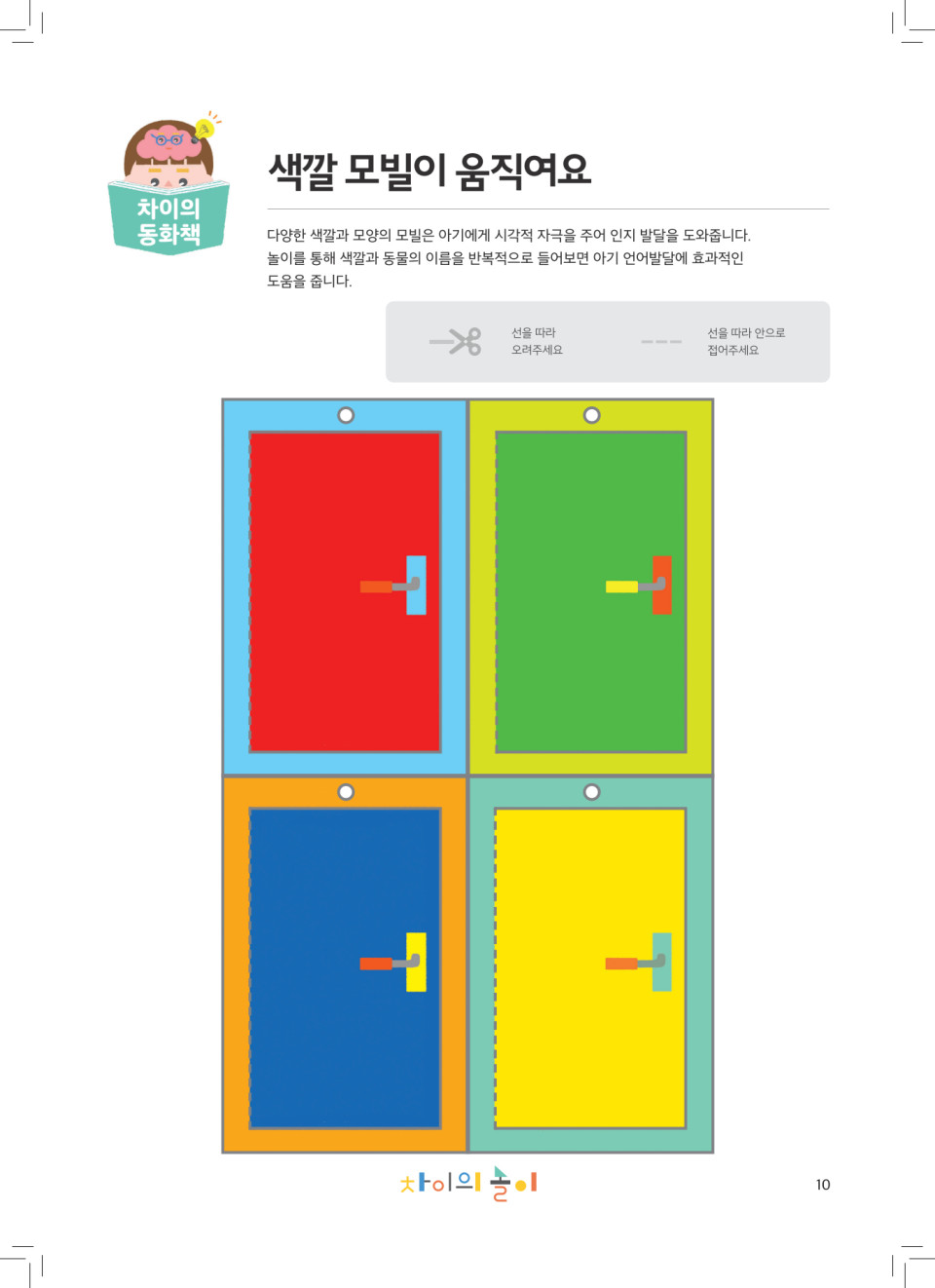 ![]() | (모빌을 손으로 살짝 움직이며) 우와! 이게 뭐지? 그림책에서 봤던 동물 친구구나! 여기 그림책에서 봤었던 노란 문과 파란 문도 있네. |