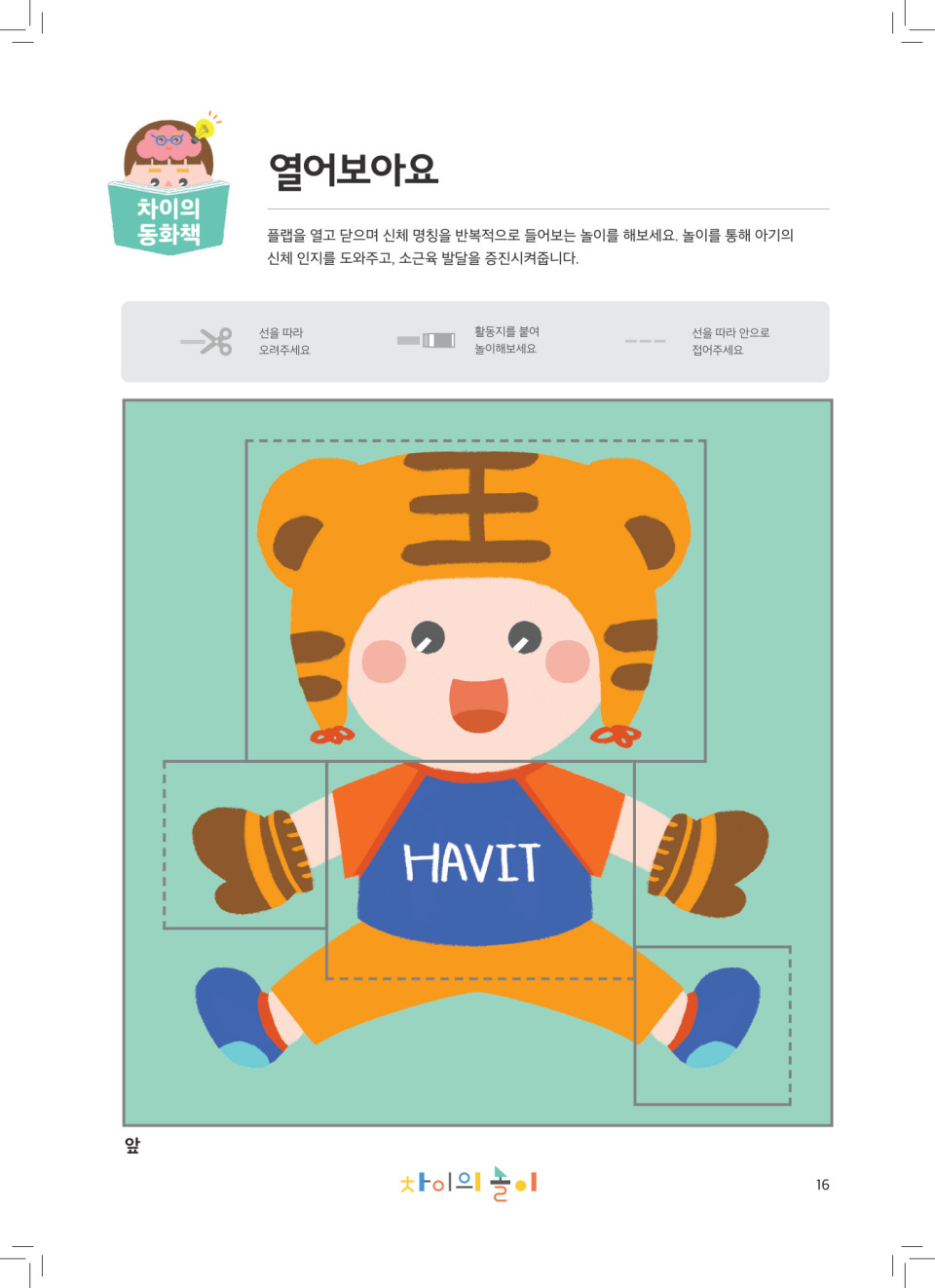 ![]() | (아기가 플랩을 열면) 모자 뒤에는 뭐가 숨어있을까? 우리 차이가 모자를 열어보니 아기 머리가 나왔네! |