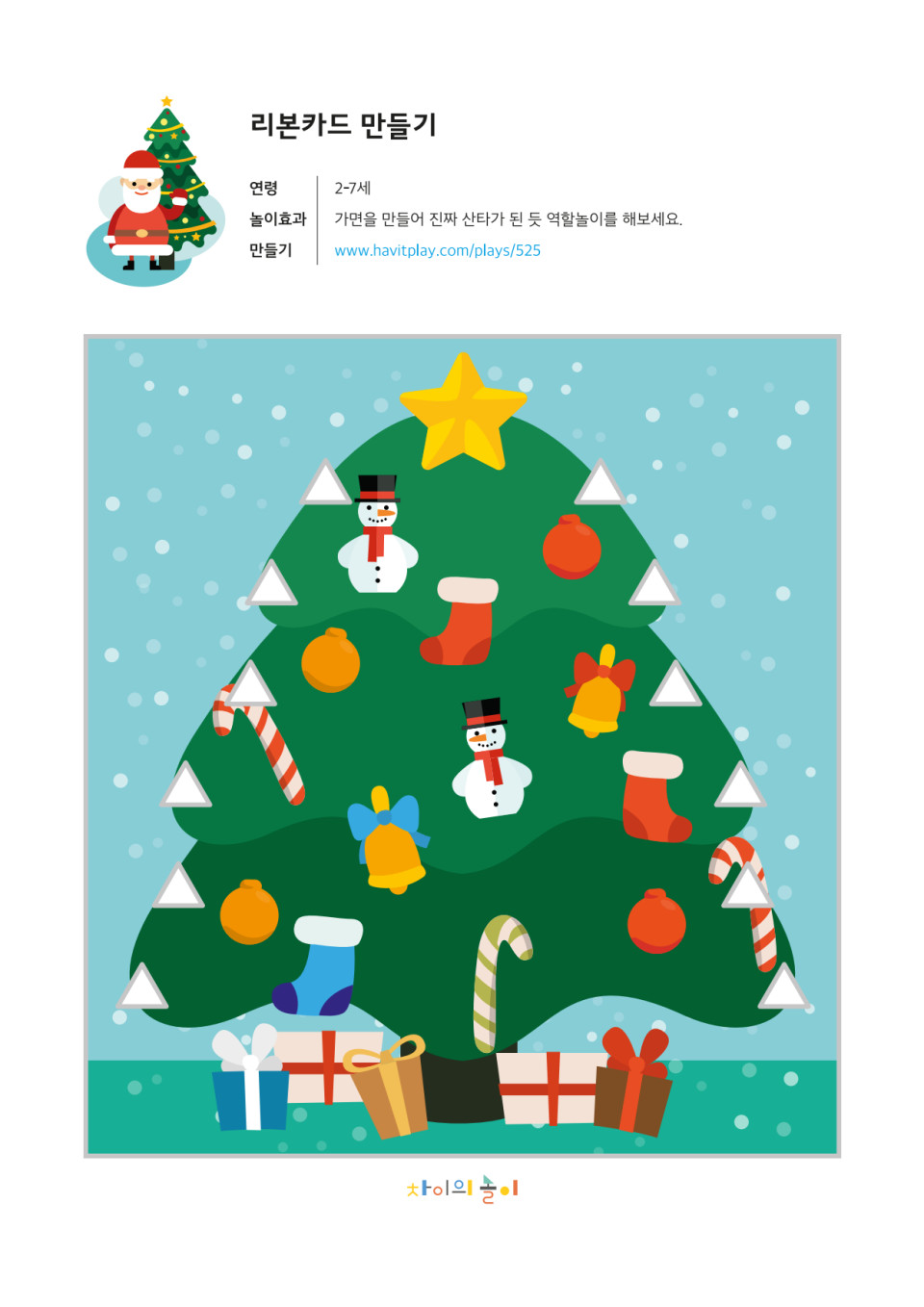 2. 구멍에 리본을 끼워 트리 모양을 만든다.