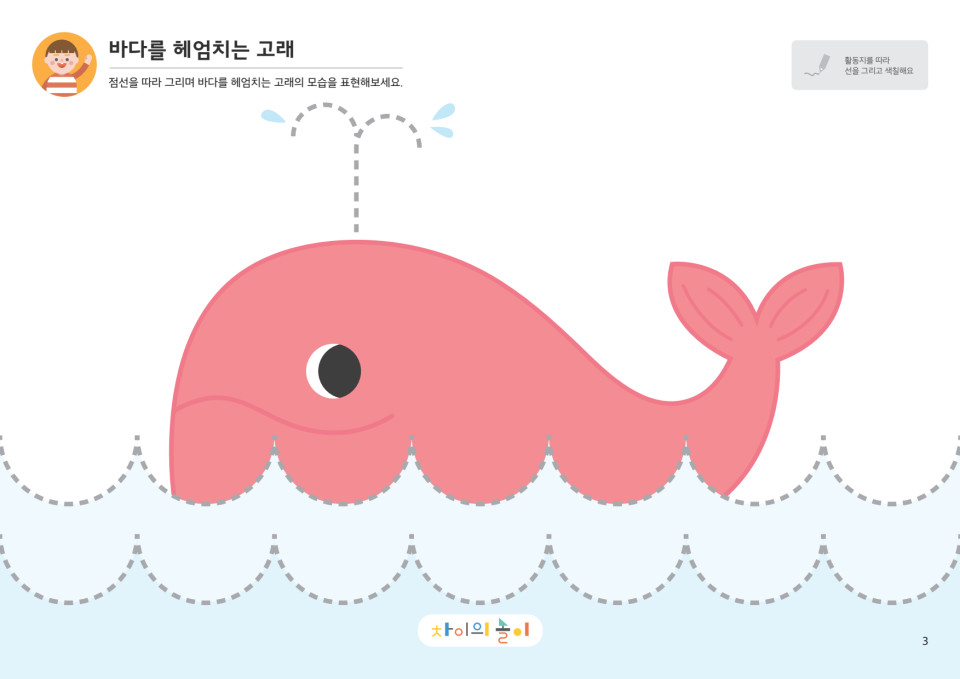 ![]() | 파도와 고래가 물을 뿜는 것을 선을 따라서 그려보자!! |