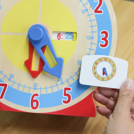 - 실제 시계의 긴 바늘, 짧은 바늘이 가리키는 숫자를 말하게 합니다.시계가 정각을 가리키는 때에 놀이하여 '몇 시' 부터 인식하도록 도와주세요.