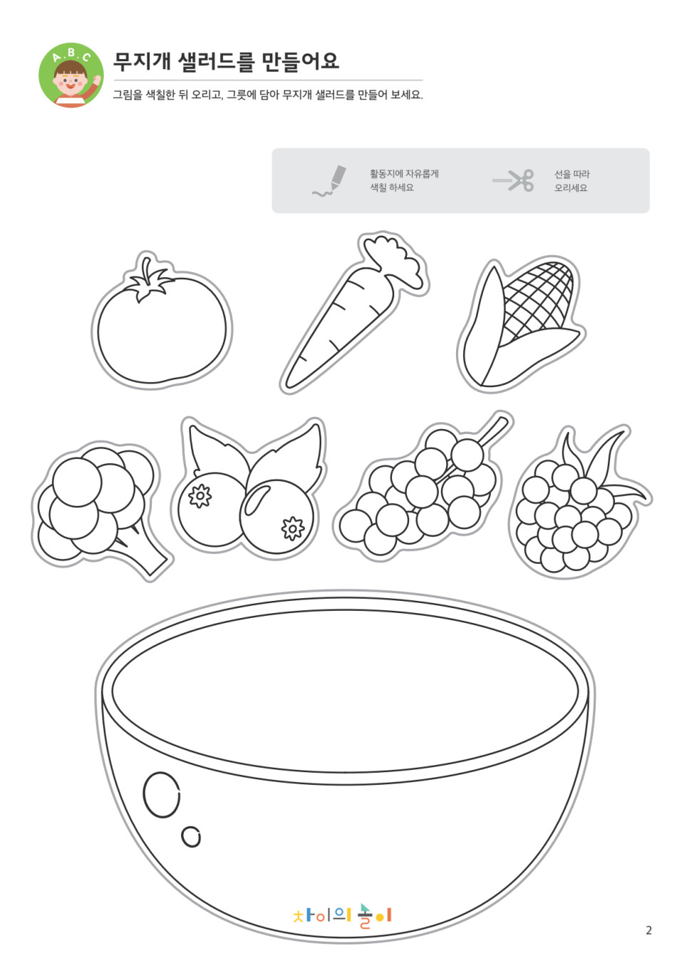 - 모두 색칠했으면, 그림들을 오려서 놀이합니다.샐러드 만드는 흉내를 내며 자연스럽게 식재료의 이름과 색을 반복해 들려주세요.