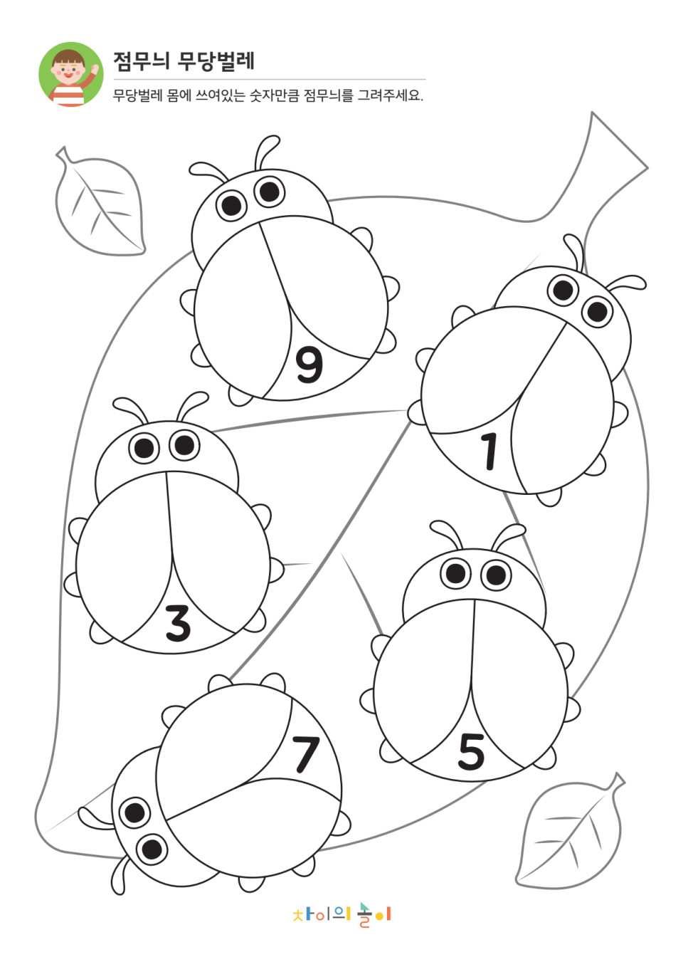 ![]() | 무당벌레 몸에 쓰여있는 숫자만큼 점무늬를 그려볼까? |
