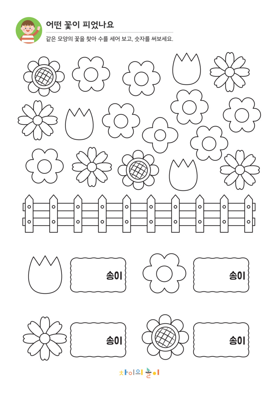 같은 모양의 꽃을 찾아 수를 세어 보고, 숫자를 써보세요.
