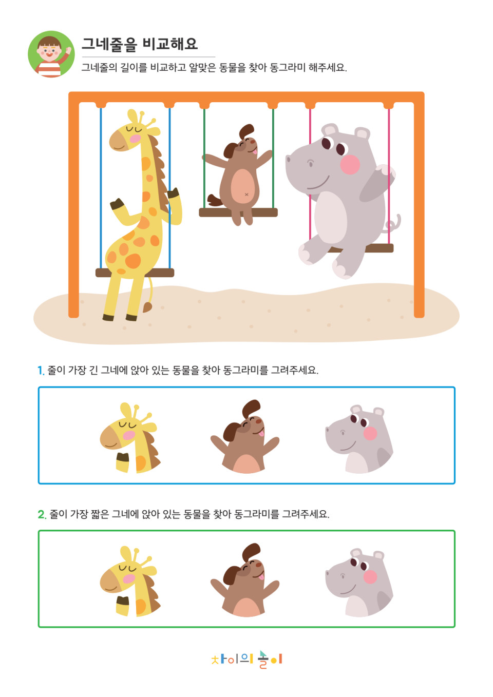 ![]() | 아하! 기린이 타고 있는 그네의 길이가 가장 길구나~ 그럼 기린 친구에게 동그라미를 해줄까? |