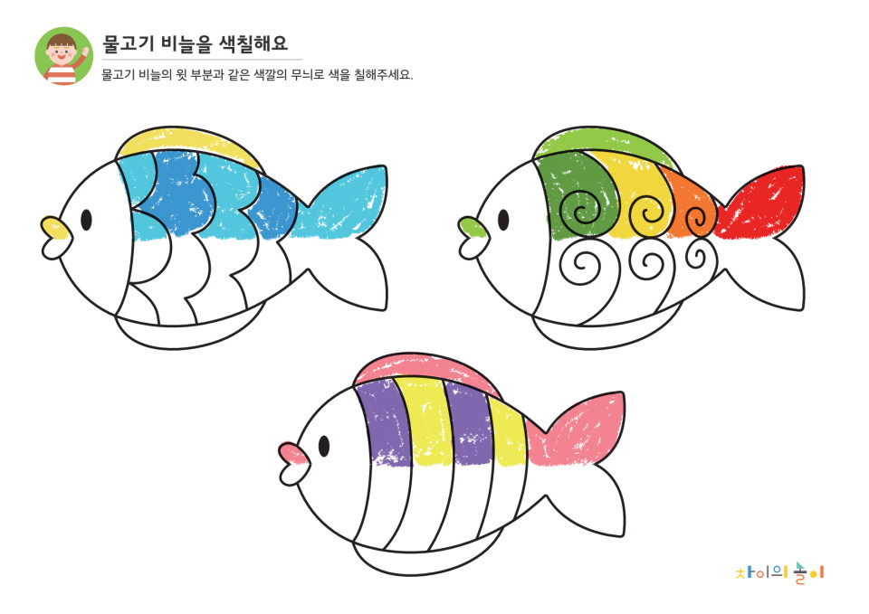 - 제시된 물고기 무늬와 같은 형태로 빈 공간을 색칠합니다.