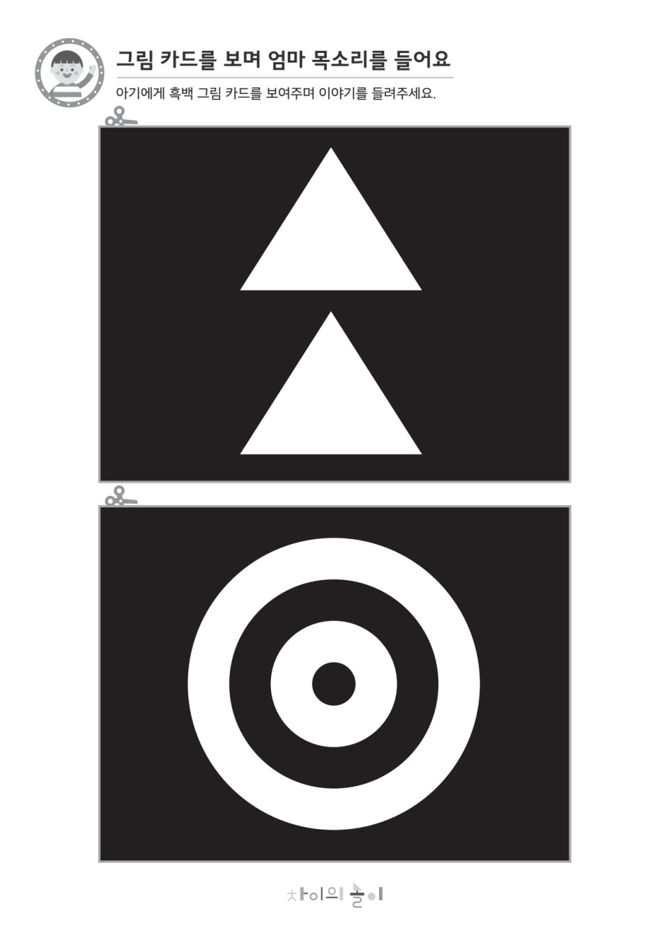 흑백 그림 카드를 보며 아기 시력 발달을 돕고, 그림을 설명해주는 엄마의 음성을 들으며 애착을 형성합니다.