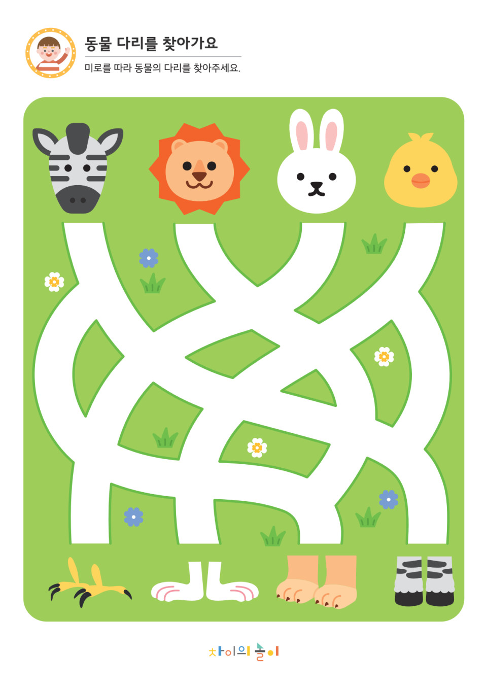 미로를 따라 알맞은 동물의 다리를 찾으며 소근육 발달과 집중력을 길러줘요.