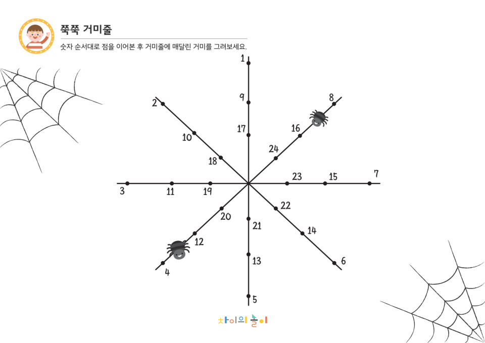 숫자 순서대로 점을 이어 거미줄을 완성해보세요.