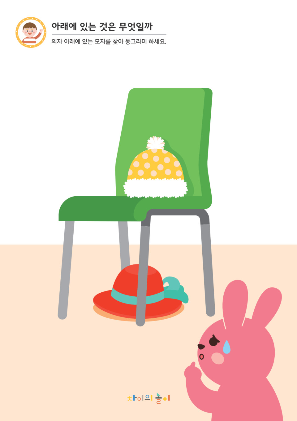- 의자 아래에 있는 모자를 찾아 동그라미 하도록 합니다.