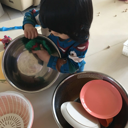 3. 아이도 종이컵과 같은 색 나무 막대를 찾아 넣어보도록 합니다.